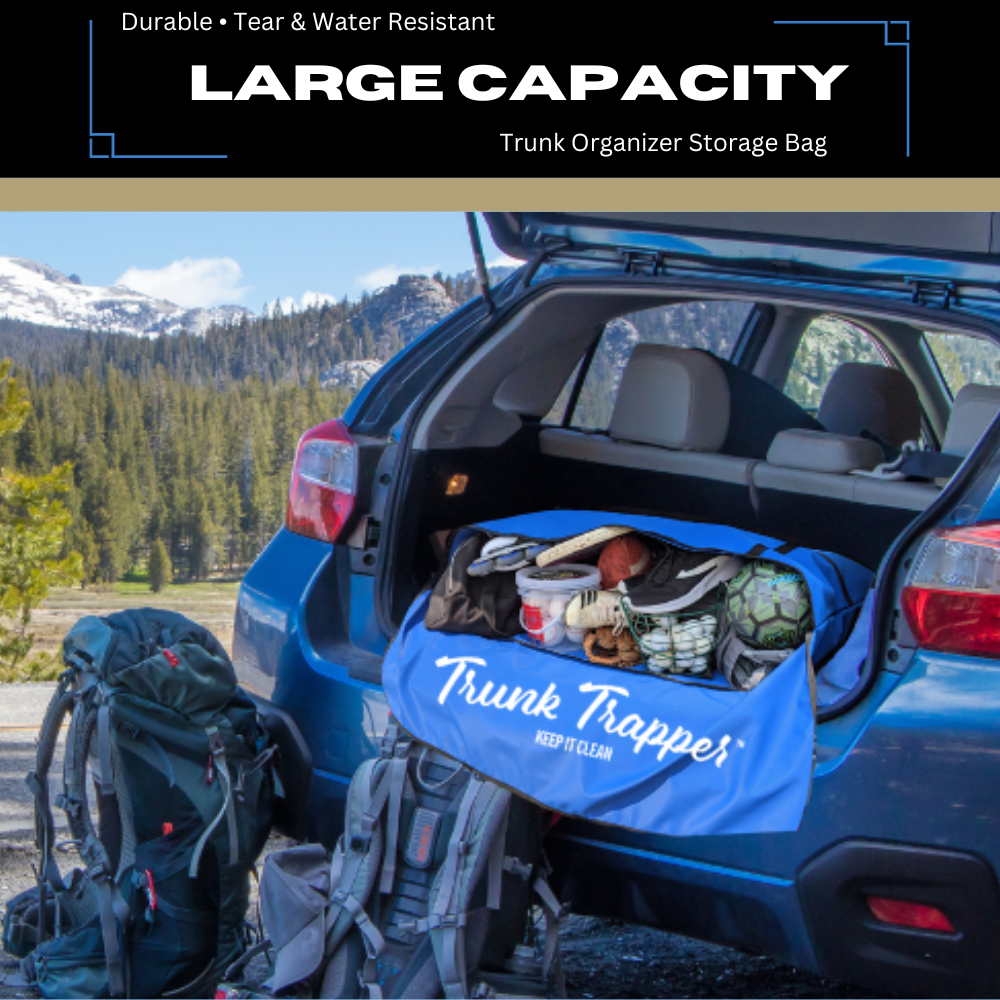 Being on the go requires a surprising amount of stuff. It's not easy to keep your items organized and accessible, and your car or truck clean. Consider the Trunk Trapper®, a car and SUV trunk organizer. Whether you have a car full of kids with sports gear, camping equipment from a weekend trip, or chairs and sand toys from a day at the beach, choose the Trunk Trapper®. It can hold it all. It will keep your items contained during your ride. But it's more than that. In case of a sudden stop, this trunk storage bag will prevent objects inside from becoming airborne hazards and will help contain a mess. The hooks keep everything secure inside. We solve your car trunk storage problems.